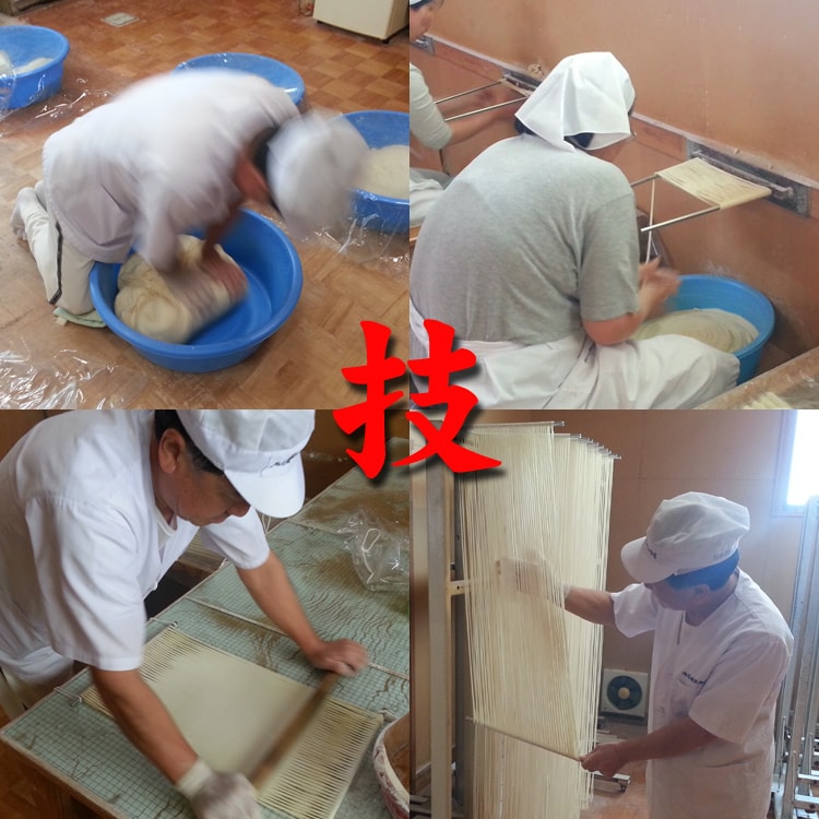 純粋な職人による手綯い(麺を2本の棒に8の字に綾がけして細くする作業)、自然乾燥など製造には3日から4日かかります。麺のコシ、弾力、なめらかさを決めるといわれる手綯い作業は熟練の職人が目にも止まらないほどのスピードと繊細さで麺を作り上げていきます!!まさに『職人の技』!!