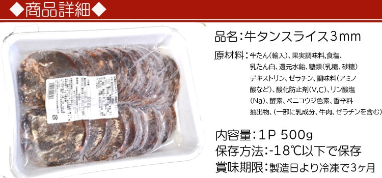 ・原材料/材質/素材:牛タン(輸入)、果実調味料、食塩、乳たんぱく、還元水飴、糖類(乳糖、砂糖)、デキストリン、ゼラチン/調味料(アミノ酸等)、酸化防止剤(V.C)、リン酸塩(Na)、酵素、ベニコウジ色素、香辛料抽出物、(一部に乳成分・牛肉・ゼラチンを含む)