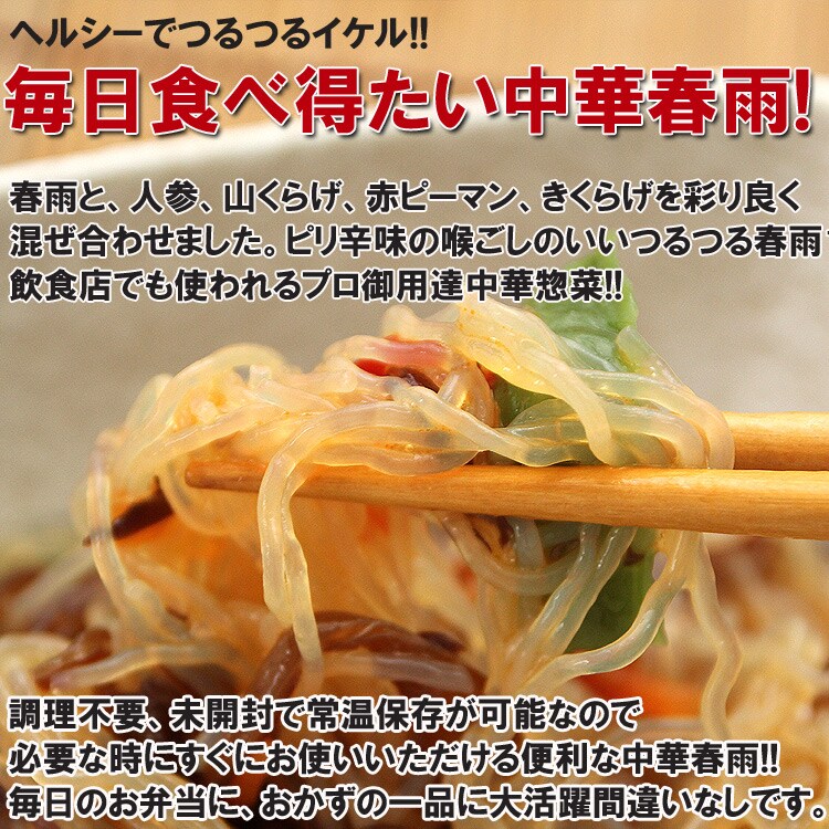 春雨(中国製造)、醤油(小麦を含む)、砂糖、人参、山くらげ、赤ピーマン、干しきくらげ、ラー油、醸造酢、食塩/調味料(アミノ酸等)、ビタミンC、増粘多糖類