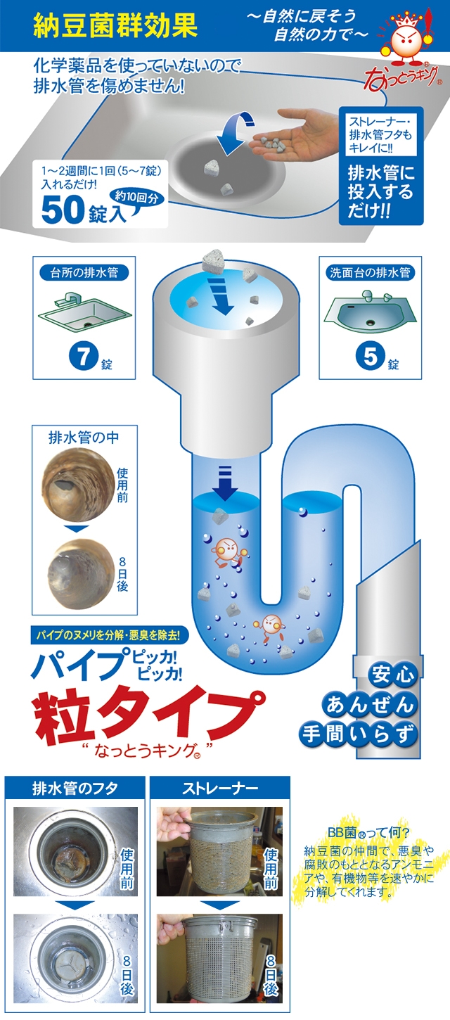 パイプピッカ!ピッカ!粒タイプ | BB菌(納豆菌同属類)の働きにより排水管パイプのヌメリ・悪臭を分解
