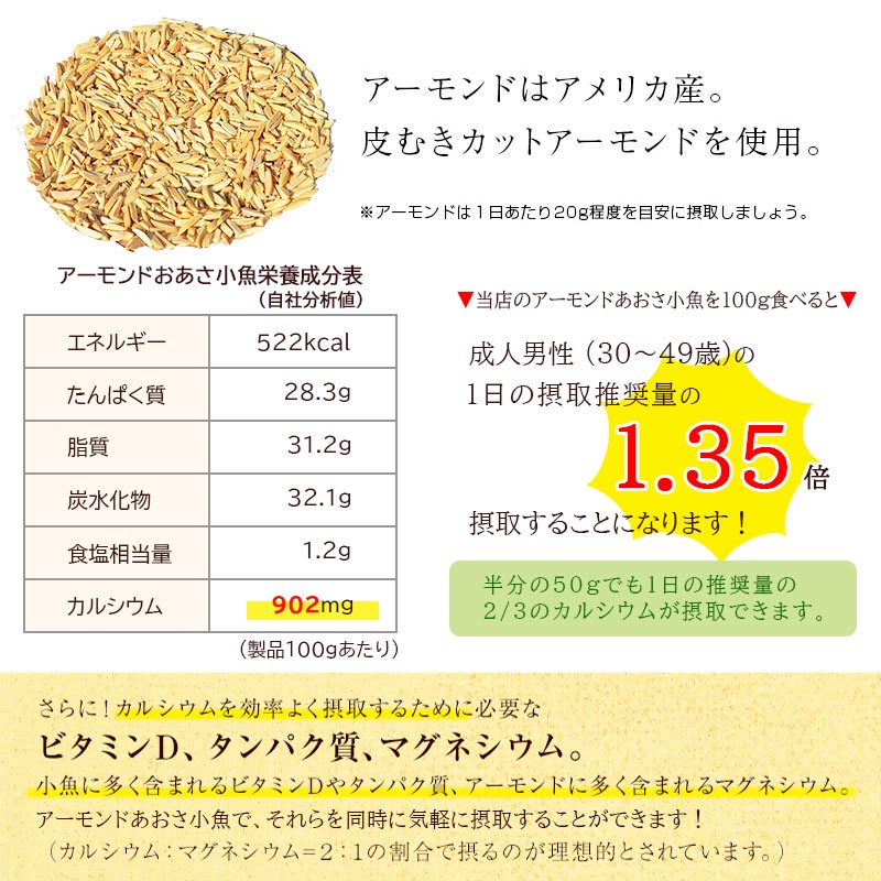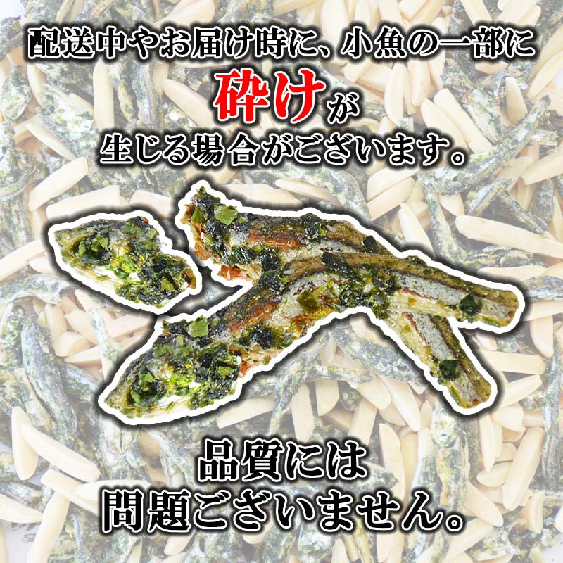 ・原材料/材質/素材:アーモンド(アメリカ産)、煮干し(いわし(国産)、食塩)、砂糖、あおさ、澱粉分解物、食塩/調味料(アミノ酸等)