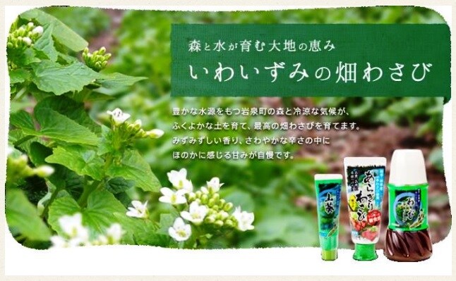 ・原材料/材質/素材:本わさび(岩泉産)、西洋わさび加工品、還元水飴、辛子加工品、植物油脂、食塩、食物繊維酸味料/酸味料、香辛料、着色料(紅花黄、クチナシ)