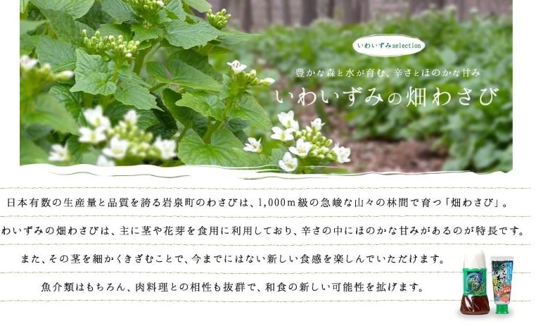 岩泉町のきれいな水と清々しい空気の中で育つ畑わさびは、鼻にツンとくる辛さとともに、ほのかな甘みがあるのが特長です。4月下旬、岩泉の桜が散るころになると「花芽わさび」の収穫時期を迎えます。「花芽わさび」は生のまま出荷したり、醤油漬けなどに加工します。また、6月中旬から9月中旬にかけて収穫される茎や根は、主に練りわさびの原料として加工しています。岩泉町の畑わさび生産量は約500t。森の中のわさび園では、夏の間収穫、出荷下ごしらえ、洗浄の作業が続きます。
