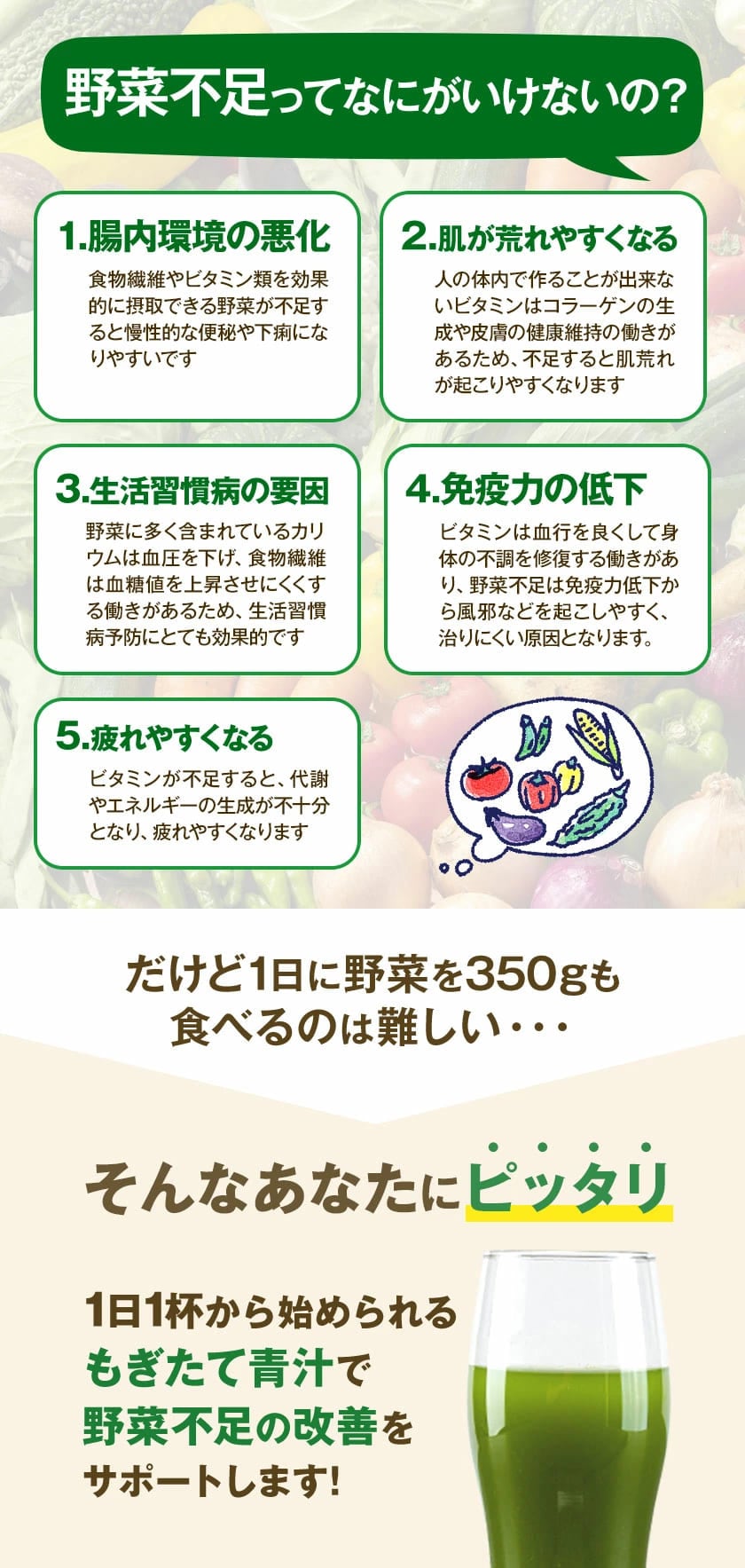 ・原材料/材質/素材:デキストリン、大麦若葉粉末、ケール末、抹茶末、ゴーヤ末、難消化性デキストリン、イソマルトオリゴ糖粉あめ、フィッシュコラーゲン、桑の葉末、豚プラセンタ抽出物、有胞子性乳酸菌/調味料(アミノ酸等)、ヒアルロン酸、V.C、抽出V.E、ナイアシン、パントテン酸カルシウム、V.B1、V.B6、V.B2、V.A、葉酸、V.D、V.B12
