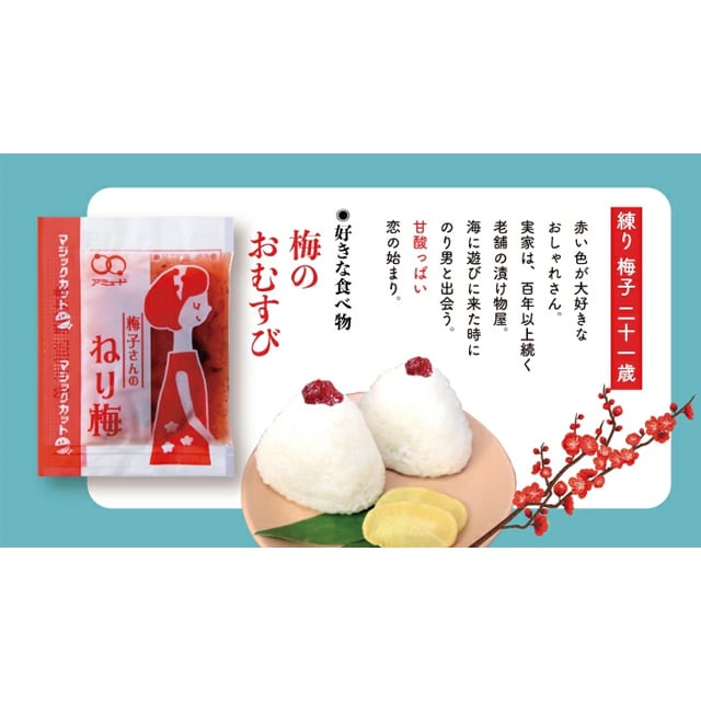 原材料:梅肉(梅(中国)、食塩)、りんごピューレ、醸造酢、砂糖、発酵調味料、かつお削りぶし、かつお節エキス、しそ塩漬け/調味料(アミノ酸等)、酸味料、酒精、野菜色素、増粘多糖類、(一部にりんごを含む)