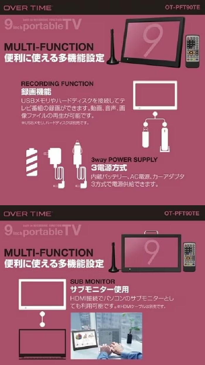 - OVER TIME 3STYLE 9インチ録画機能付きポータブルTV OT-PFT90TE