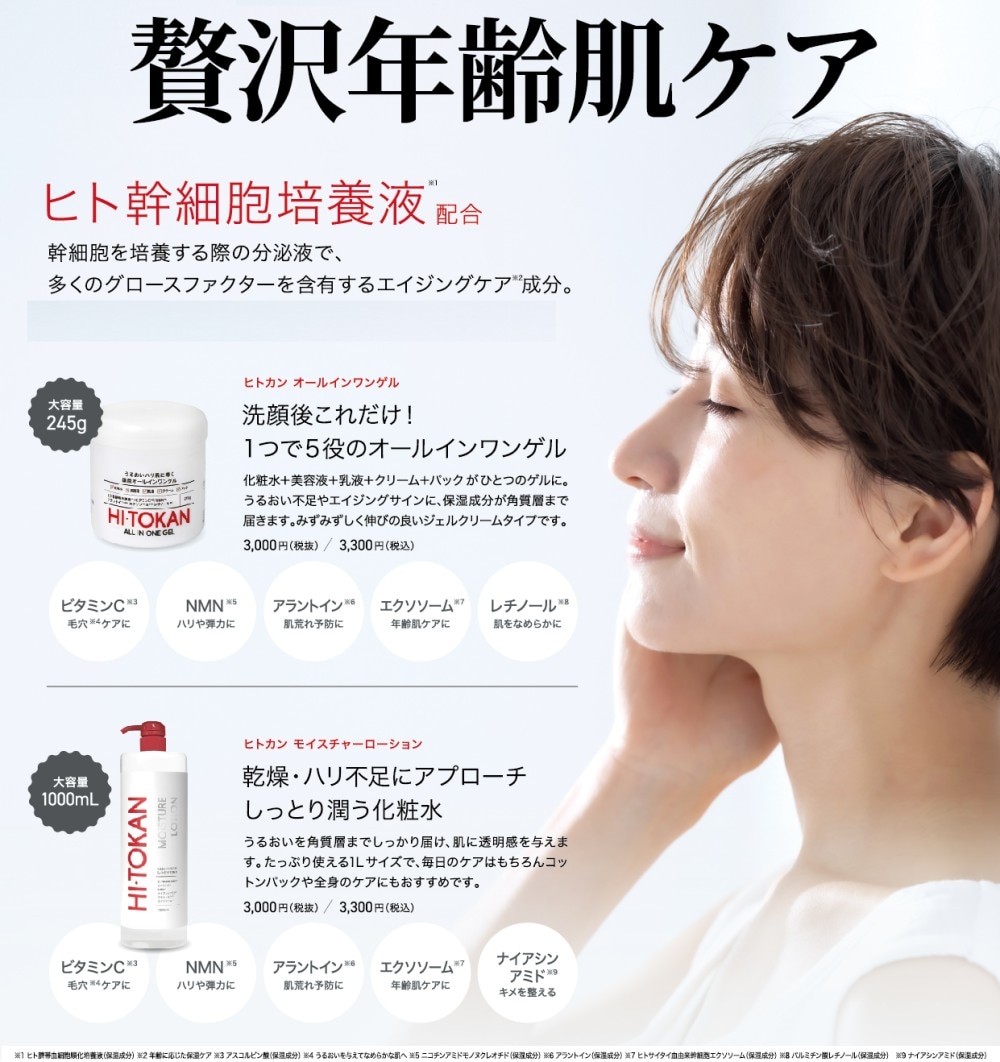ヒト幹細胞以外にも、エクソソーム、ビタミンC、NMN 、アラントイン、ヒアルロン酸、コラーゲンもふんだんに配合。