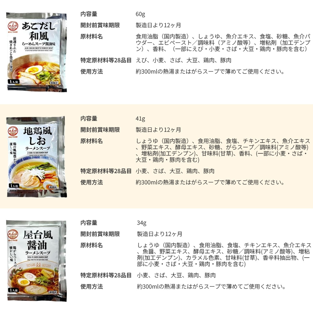 【計18袋/6種×各3袋】あみ印 ラーメンスープ6種アソート | あみ印定番のラーメンスープ小袋が6種セットになりました!