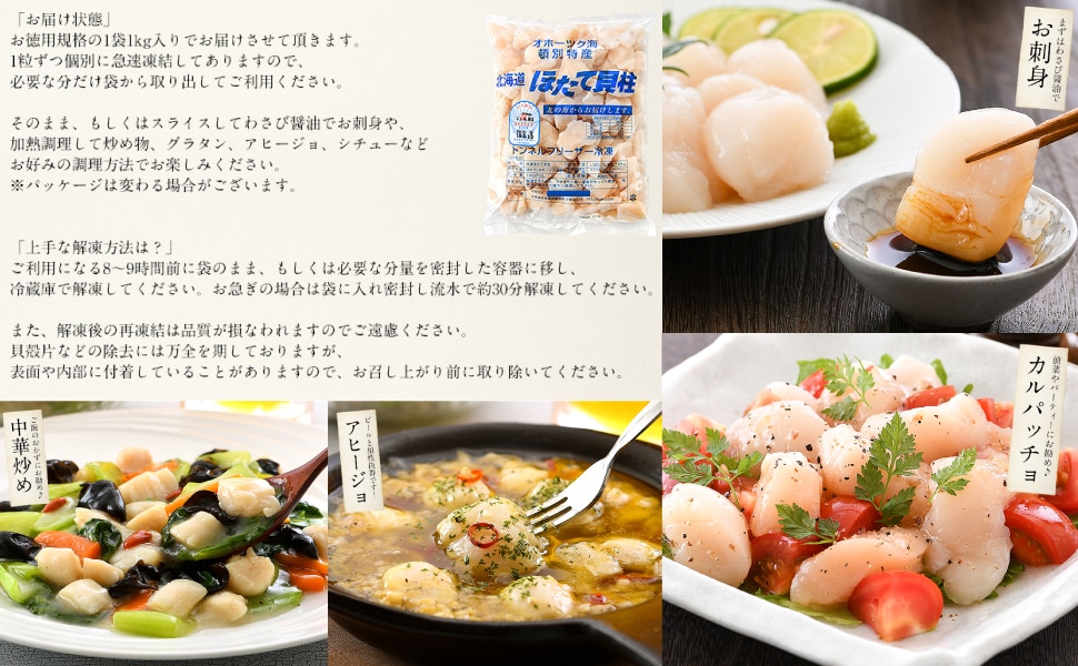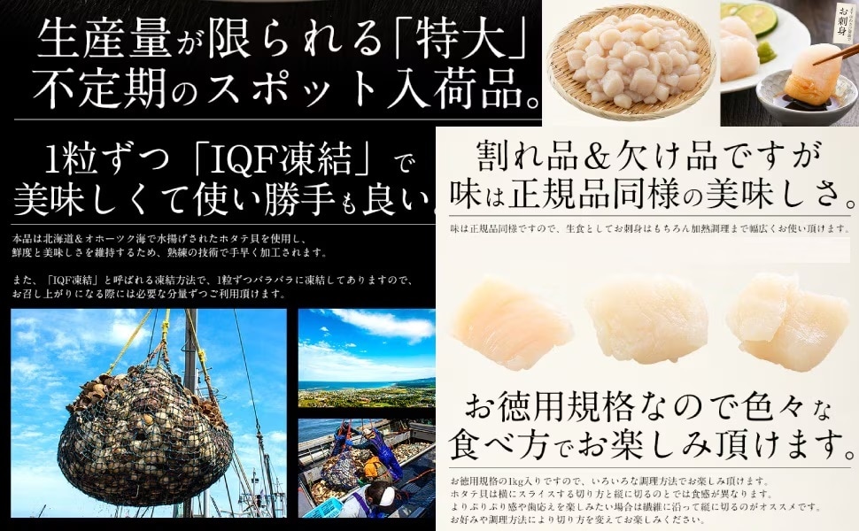 本品は正規品の製造過程で出来る「割れ・欠け・サイズ不揃い」規格ですが、味は正規品同様ですので、生食としてお刺身はもちろん、加熱調理まで幅広くお使い頂けます。