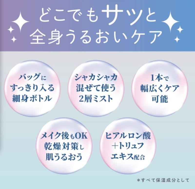 1本で全身どこでもシュシュっとスプレー出来る、2層式の美容液オイルミストです。