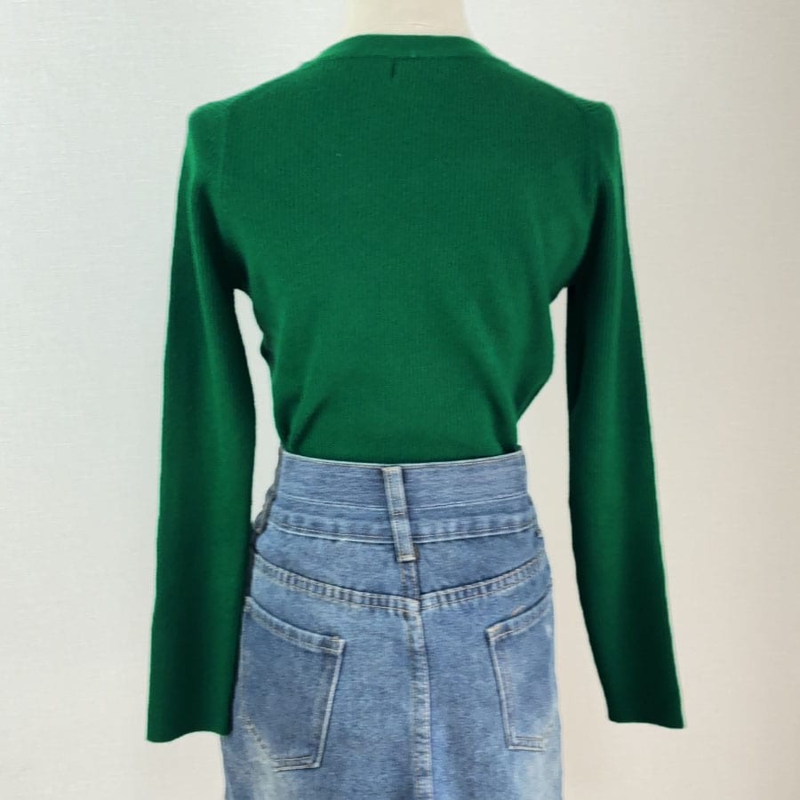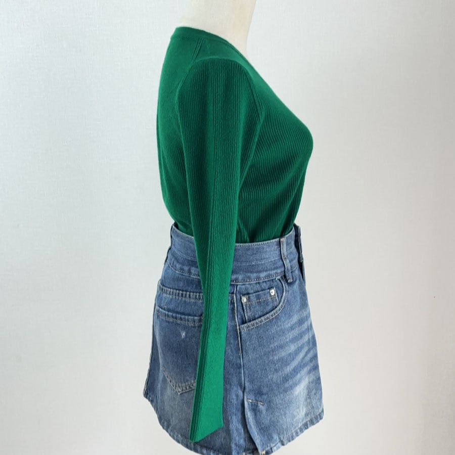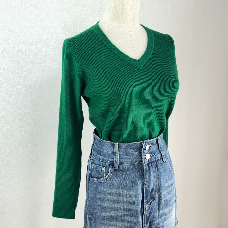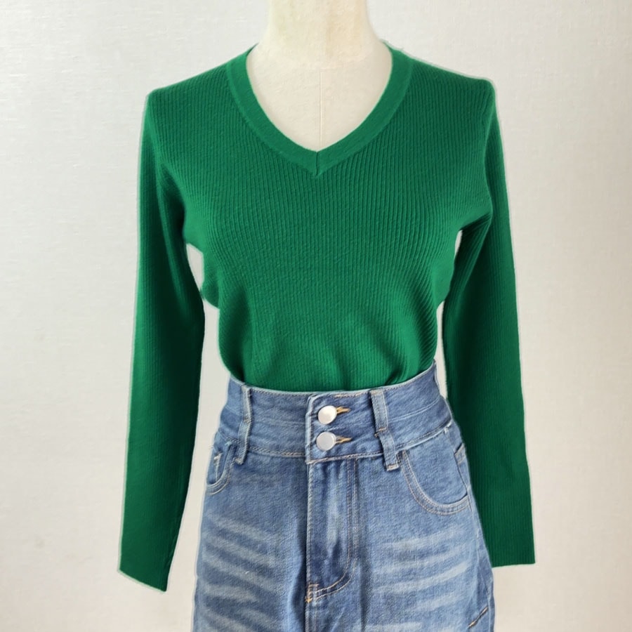 【グリーン】薄手 Vネックニットソー | 薄手で着ぶくれしない重ね着にお勧め Vネックで首元すっきり