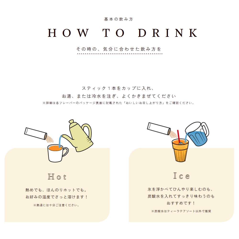 お湯や水にさっと溶けるので、寒い季節はホット、暑い日はアイスでもOK。
