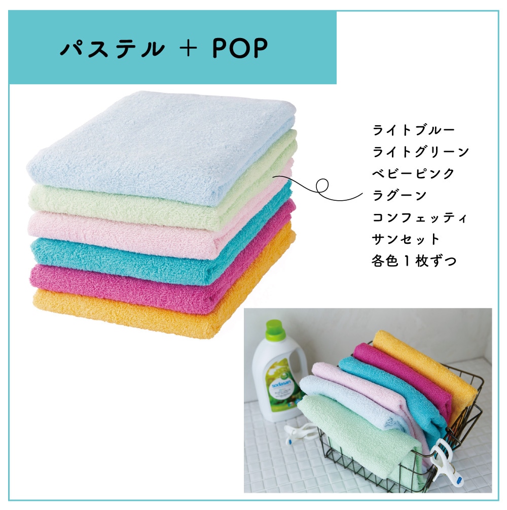 バスタオル《パステル+POP 6枚セット》 | 早く乾いて毎日洗える薄手のバスタオル|綿100パーセント お肌に優しいガムシャタオル
