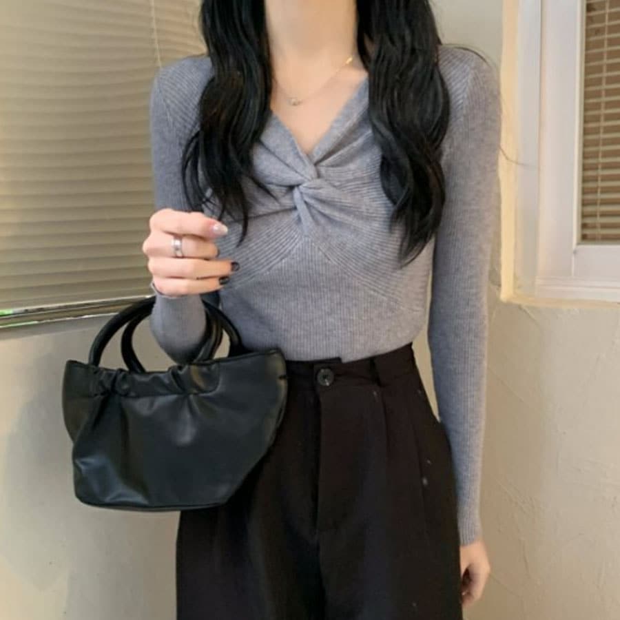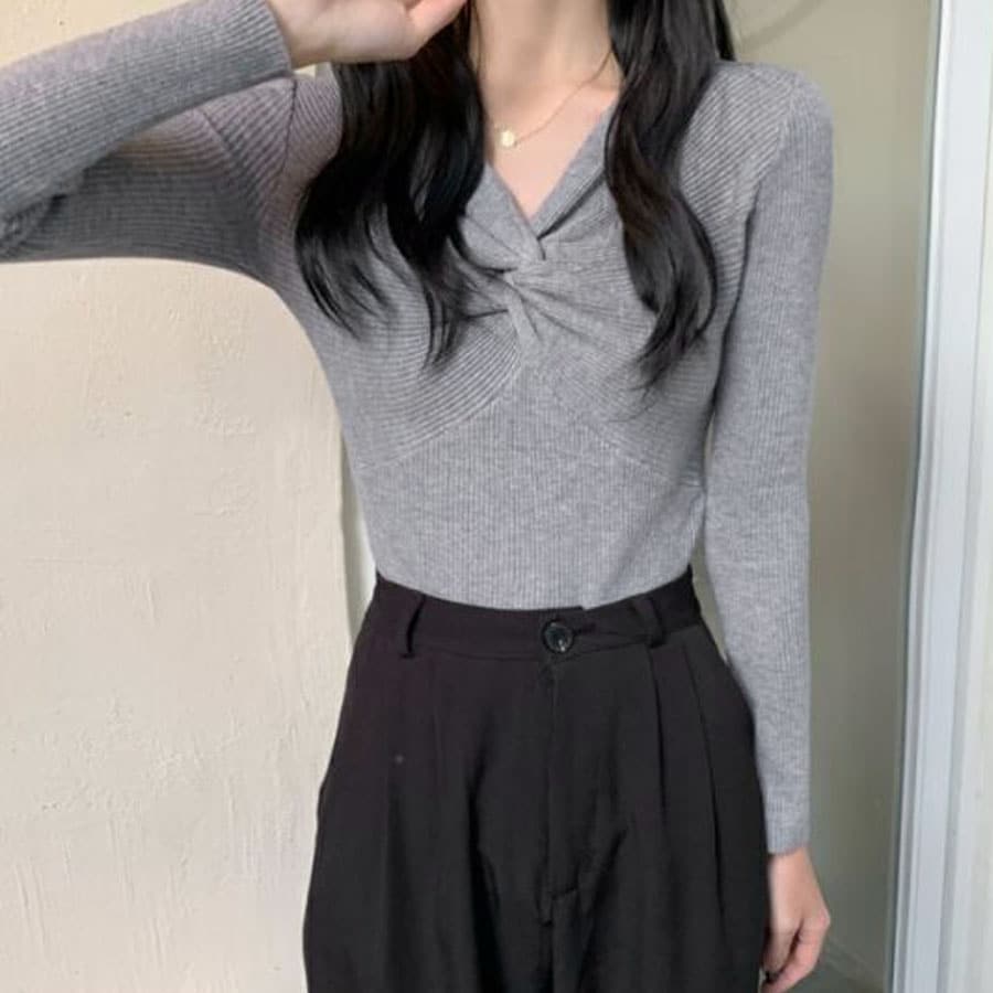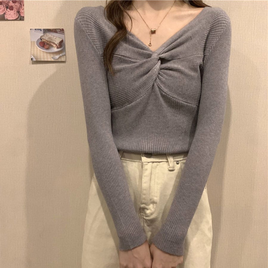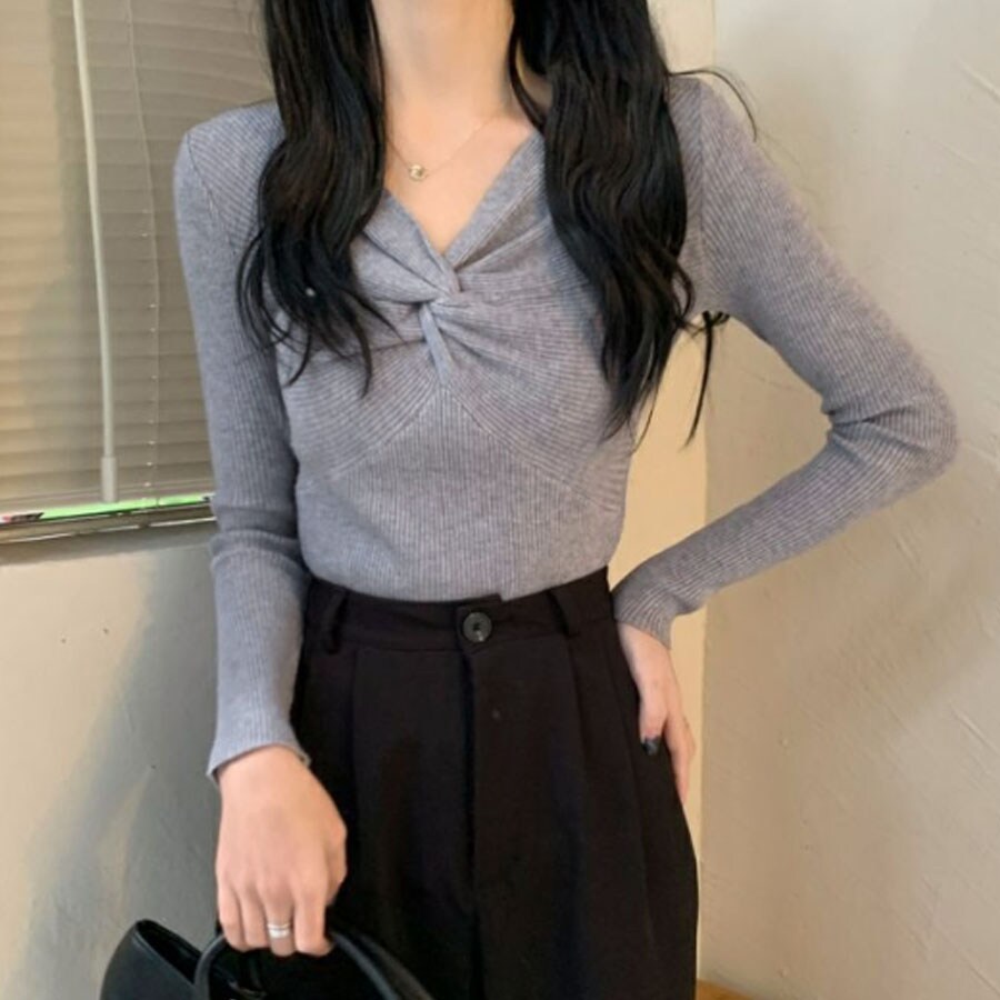 【グレー】ツイストニットセーター | 胸元のひねりがデザインポイントのニット