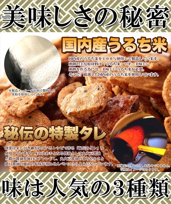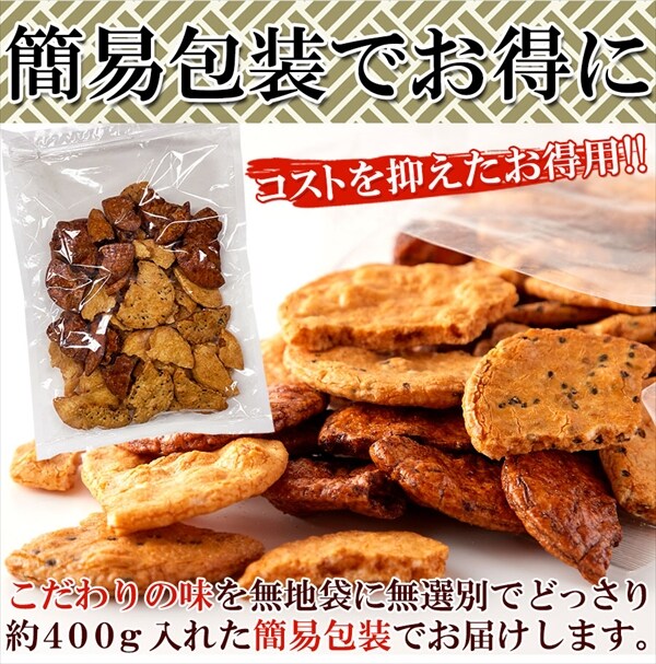 敢えてせんべいを割り、断面にタレを染み込ませた商品で、割ったせんべいのみ400g入れております。せんべいの種類は三種類全て入りますが、割合が偏る可能性がございます。