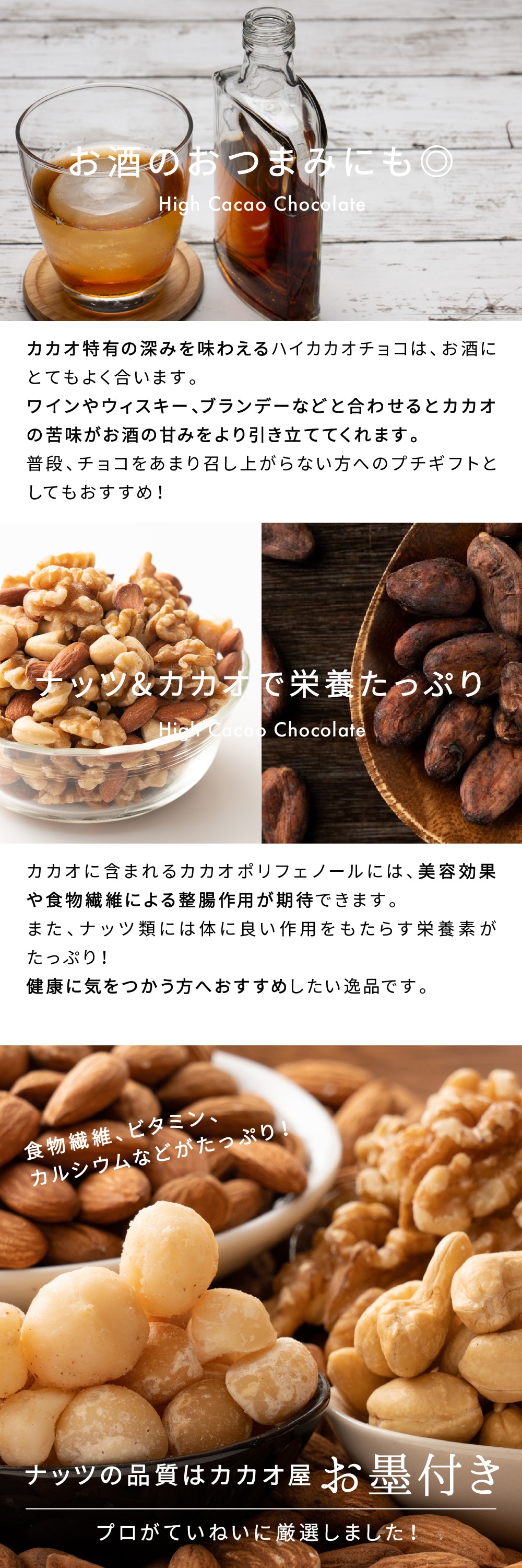 ・原材料/材質/素材:チョコレート(カカオマス、砂糖、ココアバター、全粉乳)(国内製造)、くるみ、アーモンド、カシューナッツ、マカダミアナッツ、ココアパウダー/乳化剤、香料、(一部に乳成分・くるみ・アーモンド・カシューナッツ・マカダミアナッツ・大豆を含む)