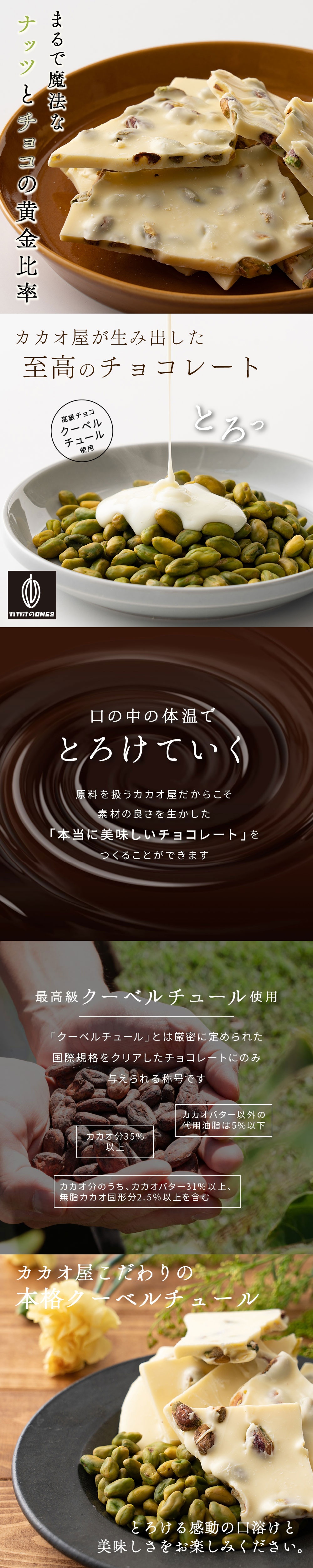 ・原材料/材質/素材:チョコレート(ココアバター、砂糖、全乳粉、脱脂粉乳)(日本製造)、ピスタチオ/乳化剤、香料、(一部に乳成分・大豆を含む)
