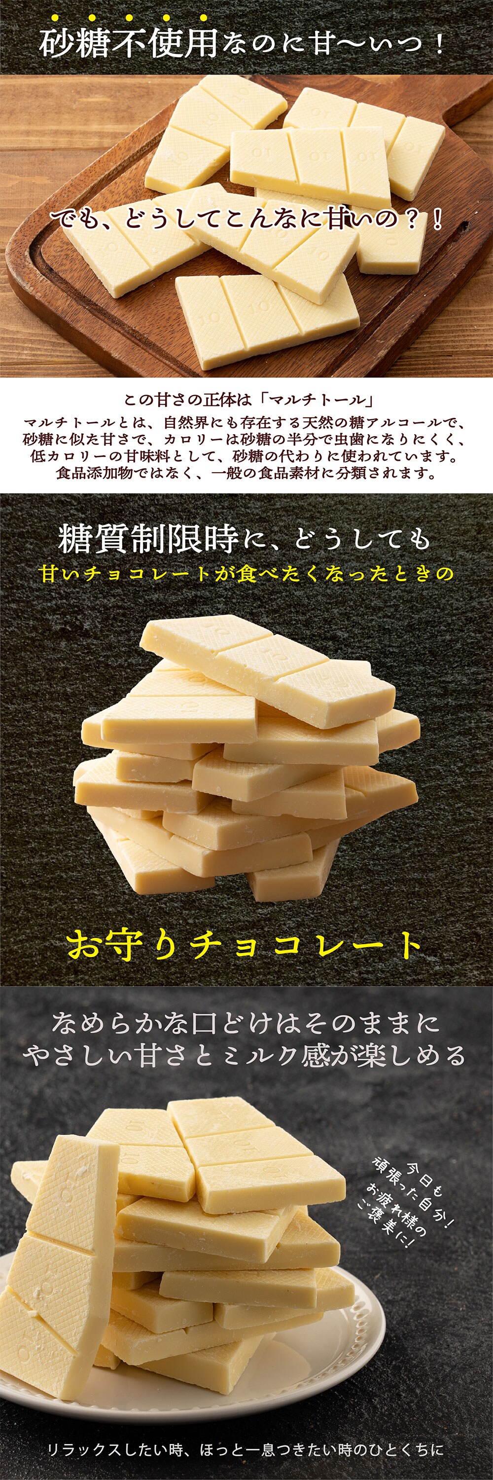 ・原材料/材質/素材:マルチトール、全乳粉、ココアバター/乳化剤、香料、(一部に乳成分・大豆を含む)