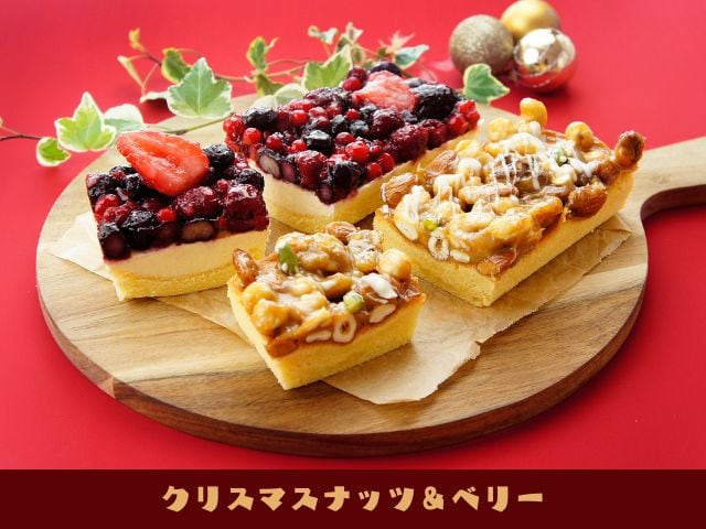 ナチュラルチーズと北海道産生クリームを使用したなめらかなレアチーズケーキの上に甘酸っぱい5種類のベリーをトッピングした『5種のベリー贅沢レアチーズケーキ』とアーモンド風味のスポンジケーキにキャラメルソースと5種類のナッツをトッピングした香ばしい『5種のナッツ贅沢キャラメルケーキ』のクリスマスセットです。