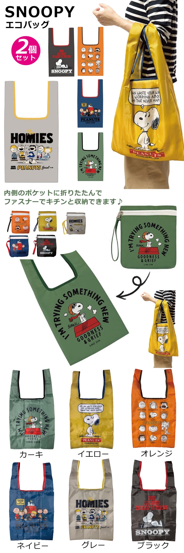【2個セット:グレー+他1色】スヌーピー折りたたみエコバッグ | 折りたたんでコンパクトに収納!ちょっとしたお買い物に便利なサイズ感がGOOD♪