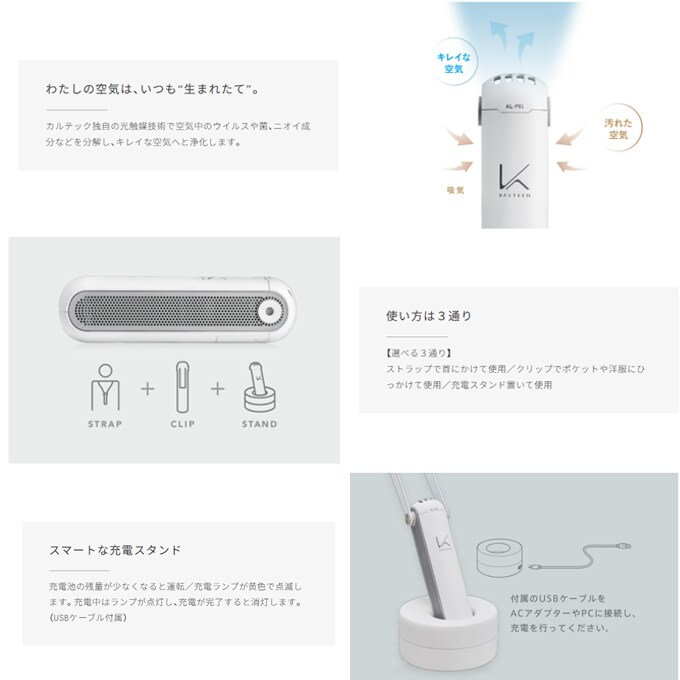 【ホワイト】カルテック 光触媒 パーソナル空間除菌 脱臭機 KL-P01 | 首にかけて・洋服にひっかけて・充電スタンドを置いて使用