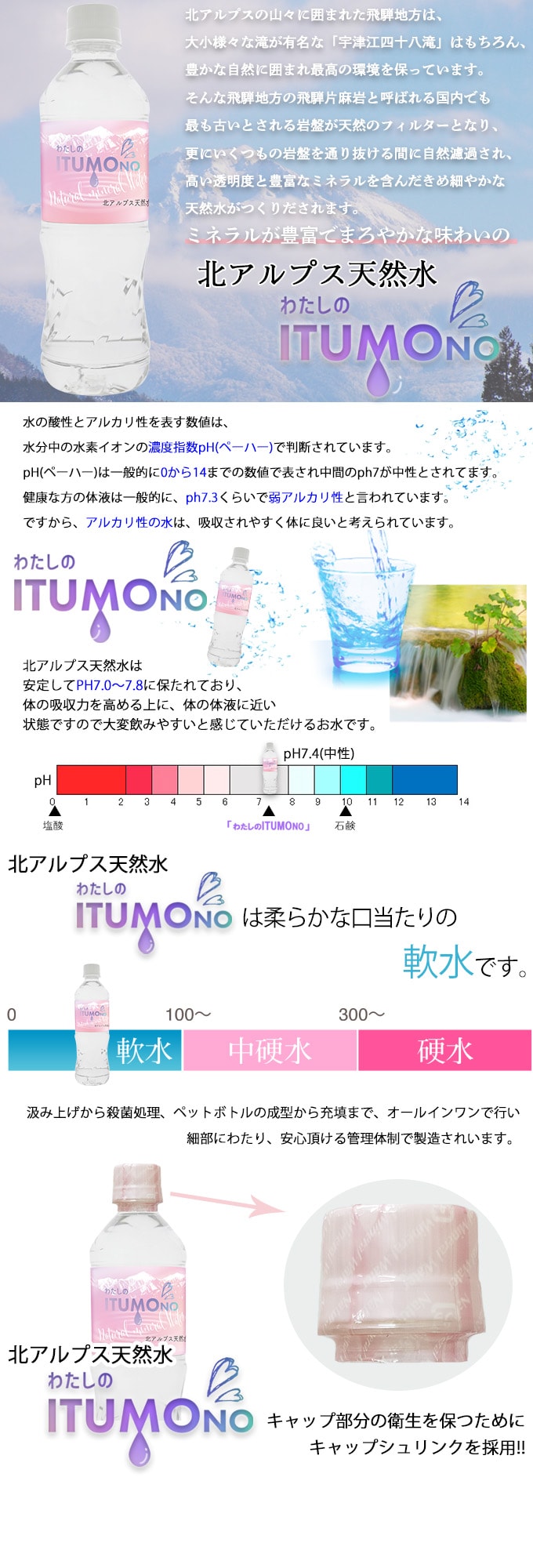 【500ml×48本】北アルプス天然水 わたしのITUMOno (いつもの)【宅配2個口配送】 | 飛騨山脈の岩盤深層より湧き出る天然水で作られた北アルプス天然水です。