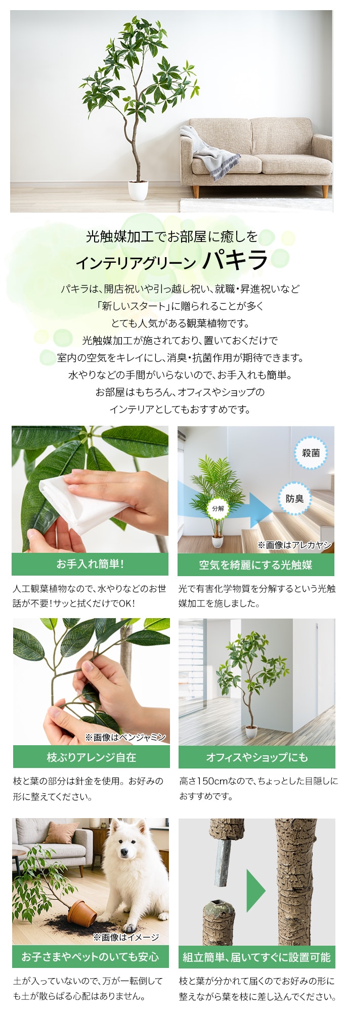 「部屋に大きなグリーンが欲しいけど、枯らしてしまうのが心配」「日当たりの悪い場所にも観葉植物を置きたい」そんな方に最適な、光触媒加工が施されたパキラの人工観葉植物です。