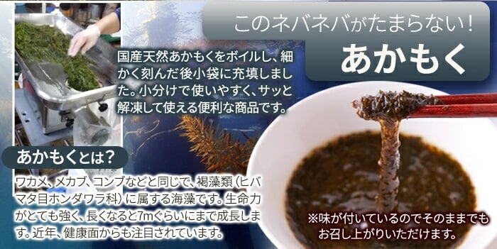 解凍して盛り付けるだけで簡単。但しアカモクは食物繊維が豊富な為消化器官の弱い方は食べる量を控えることをおすすめします。
