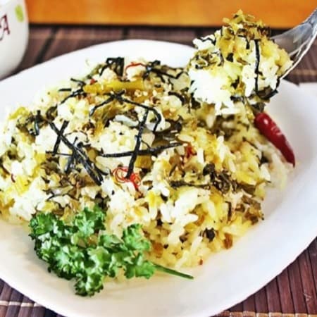 細かく刻んだ高菜漬けと一緒に炒めました。