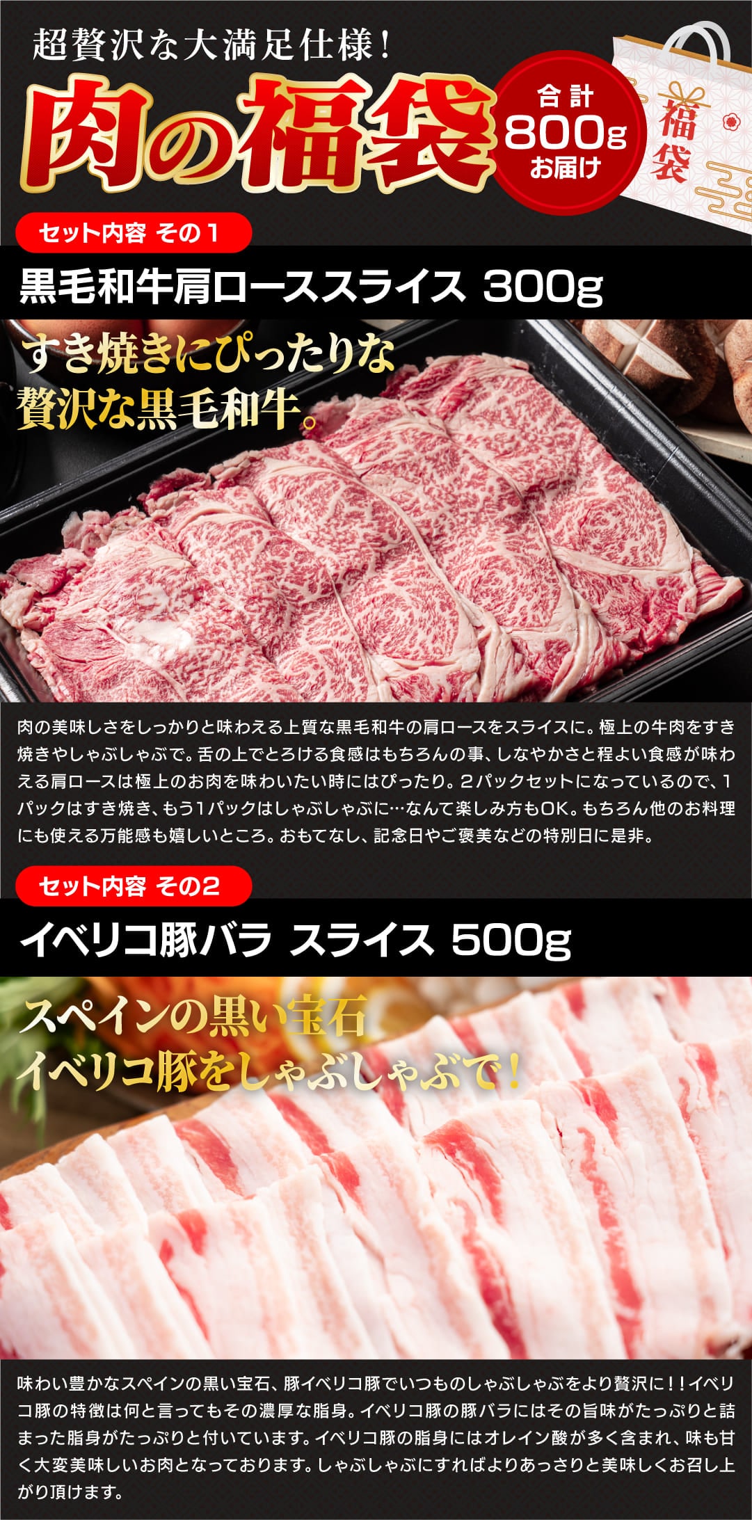 【福袋800g】イベリコ豚バラ&和牛肩ローススラ | 本場スペイン産イベリコ豚バラスライス&黒毛和牛肩ローススライスの贅沢な福袋セットです!
