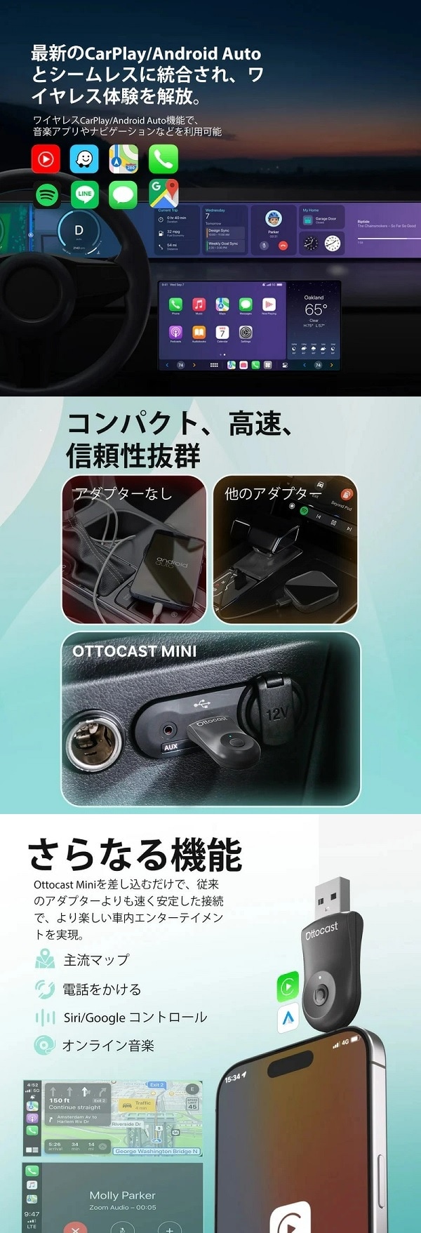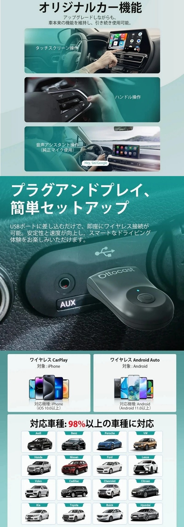OTTOCAST MINI ワイヤレスCarPlay Android Autoアダプター | ワイヤレスCarPlay/Android Autoにアップグレード