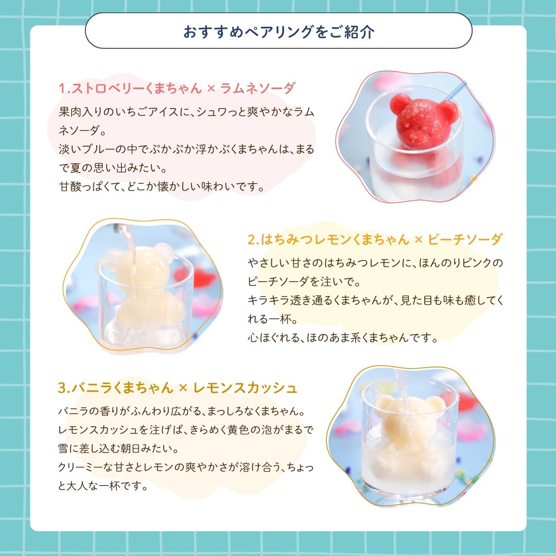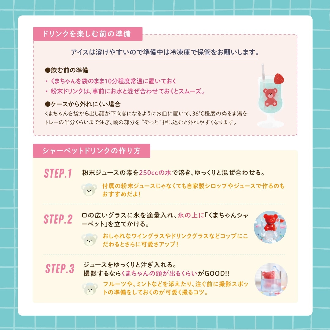 ・お召し上がり方:付属の粉末ジュースの素を水に溶かしてくまちゃんシャーベットを浮かべてお楽しみください。