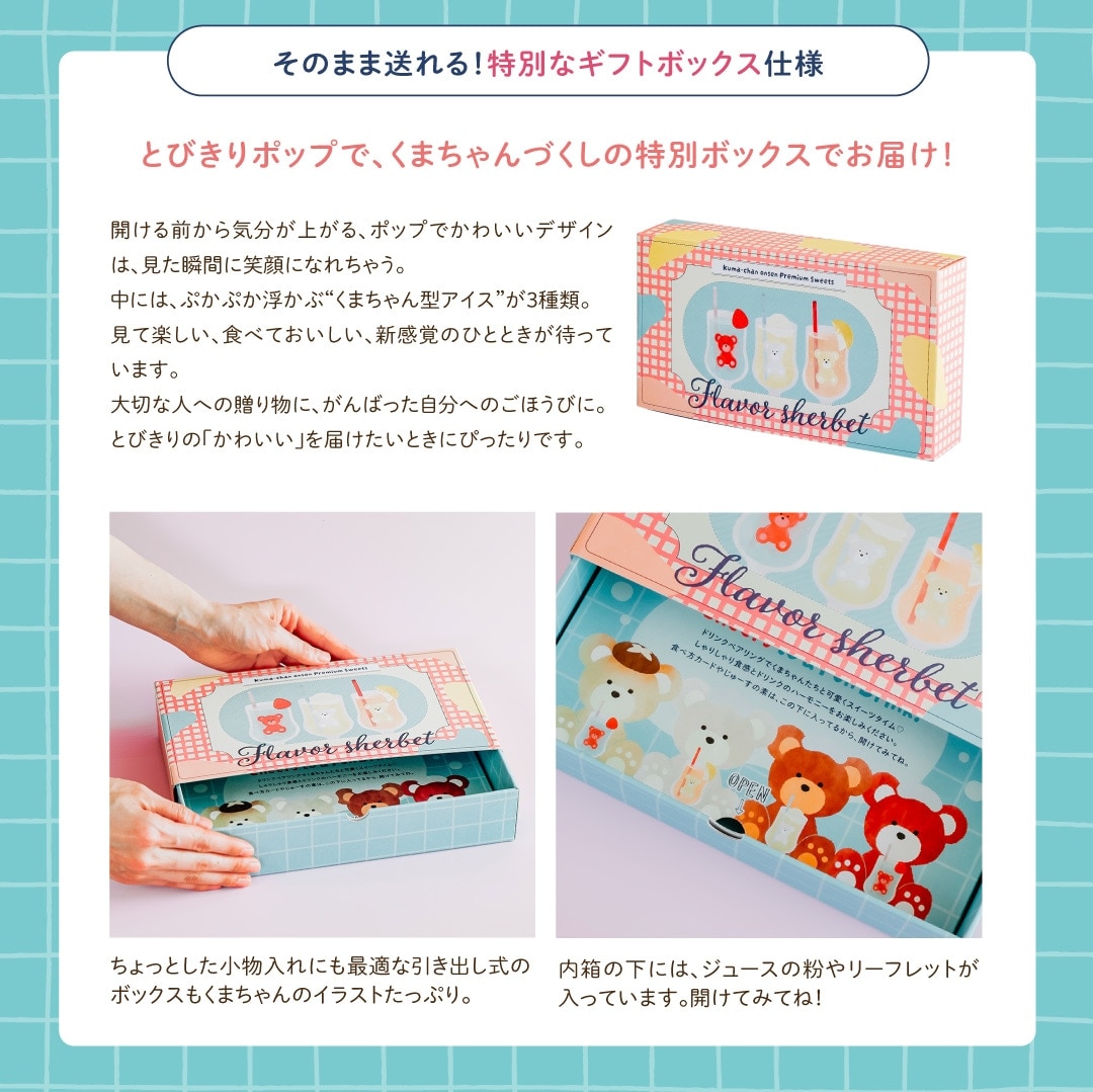 ドリンクとペアリングしたバニラ / はちみつレモン / ストロベリー3種類のくまちゃん型アイスをかわいいギフトボックスに入れてお届け!