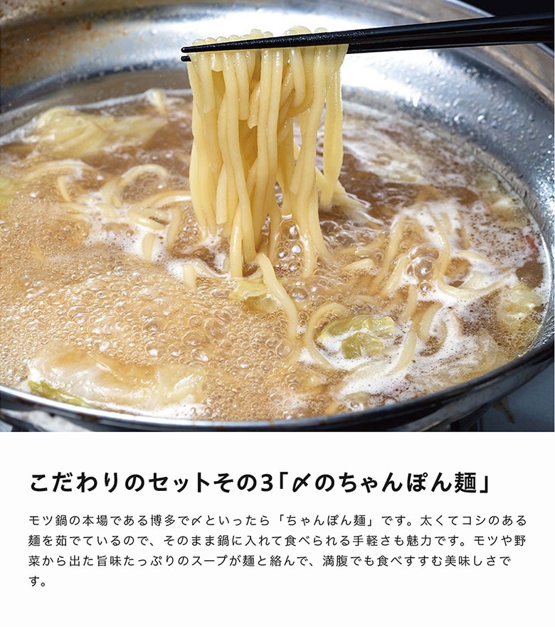 セットは、牛モツ、スープ、ちゃんぽん麺に、にんにくチップと唐辛子がついて2人前です。野菜や豆腐を入れて火にかけるだけで、本格牛モツ鍋を楽しめます。