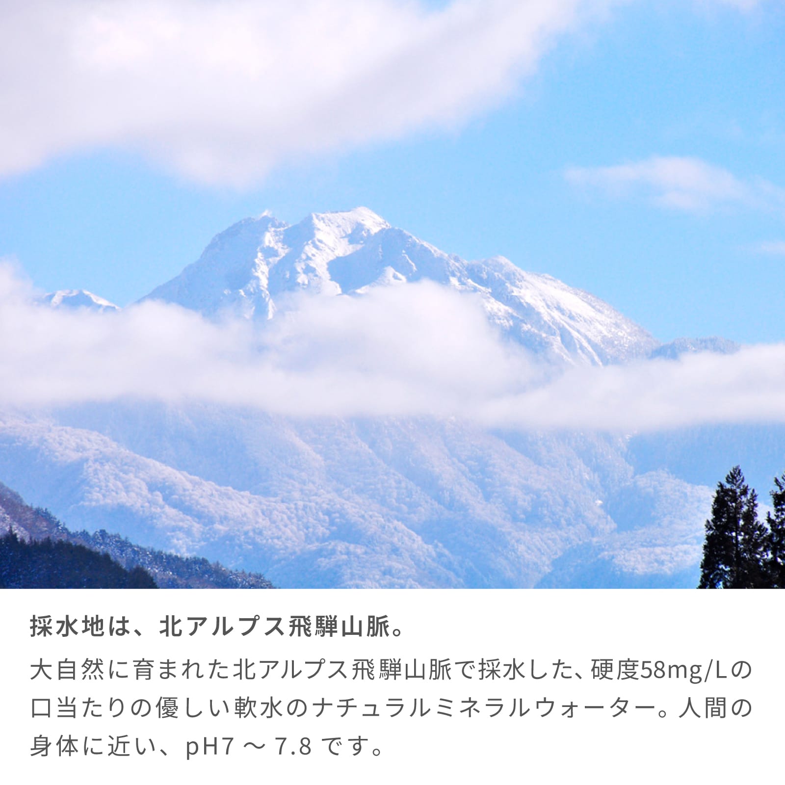 大自然に育まれた北アルプス飛騨山脈で、採水した、硬度58mg/Lの口当たりの優しい軟水のナチュラルミネラルウォーター。人間の身体に近い、pH7-7.8です。