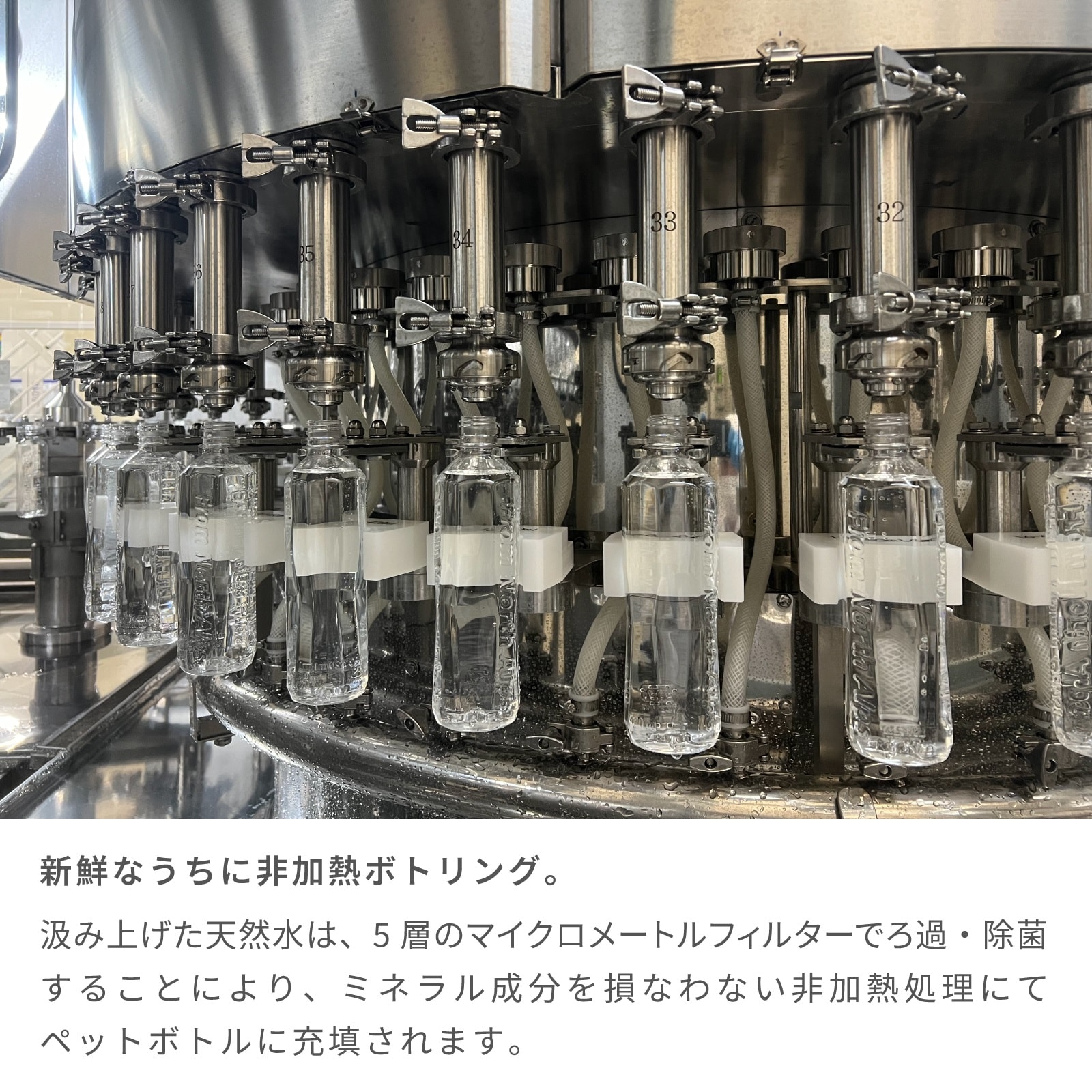 汲み上げた天然水は、5層のマイクロメートルフィルターでろ過・除菌することにより、ミネラル成分を損なわない非加熱処理にてペットボトルに充填されます。