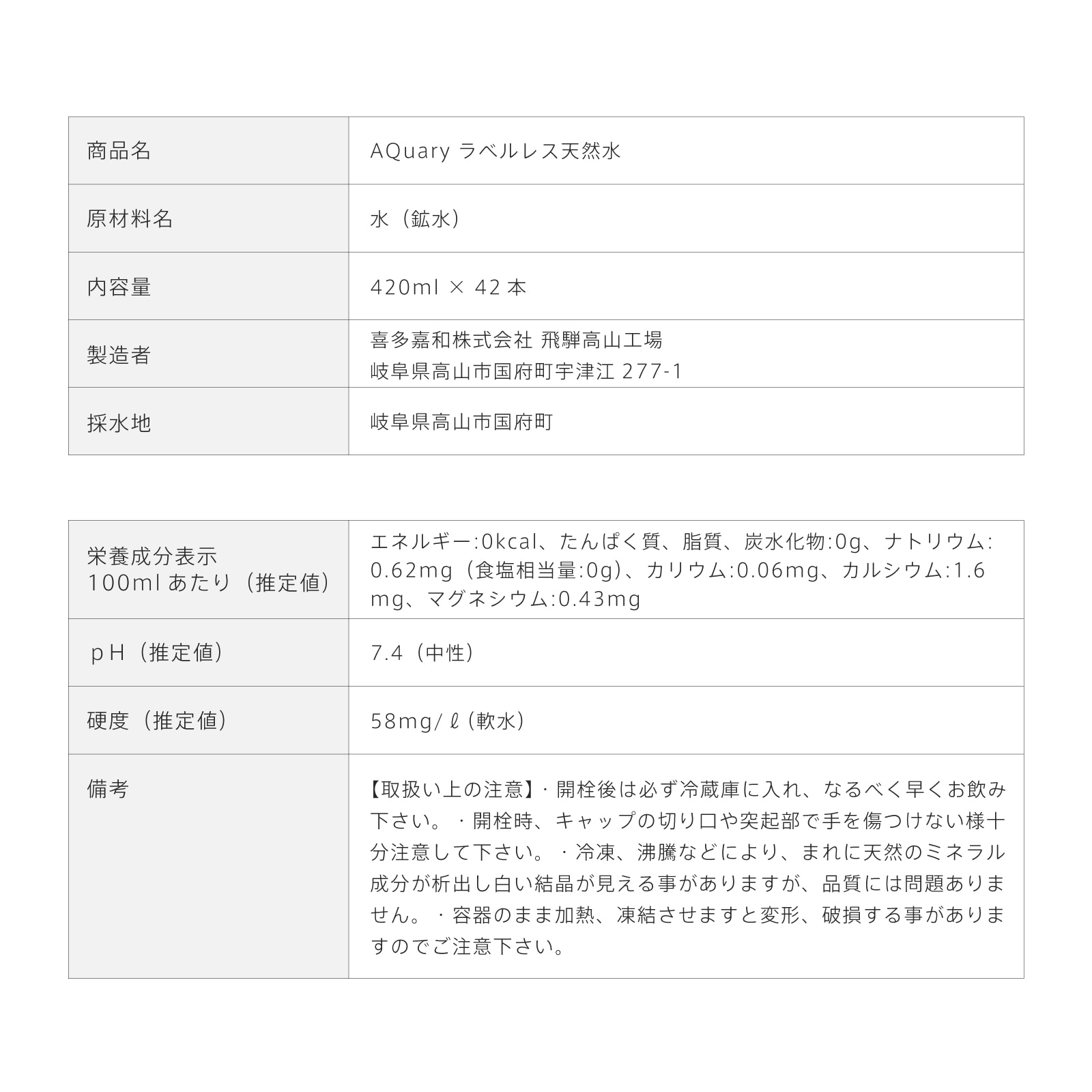 【 420ml×42本 】ナチュラルミネラルウォーター ラベルレス 軟水 | 採水地は、北アルプス飛騨山脈。新鮮なうちに非加熱ボトリング。