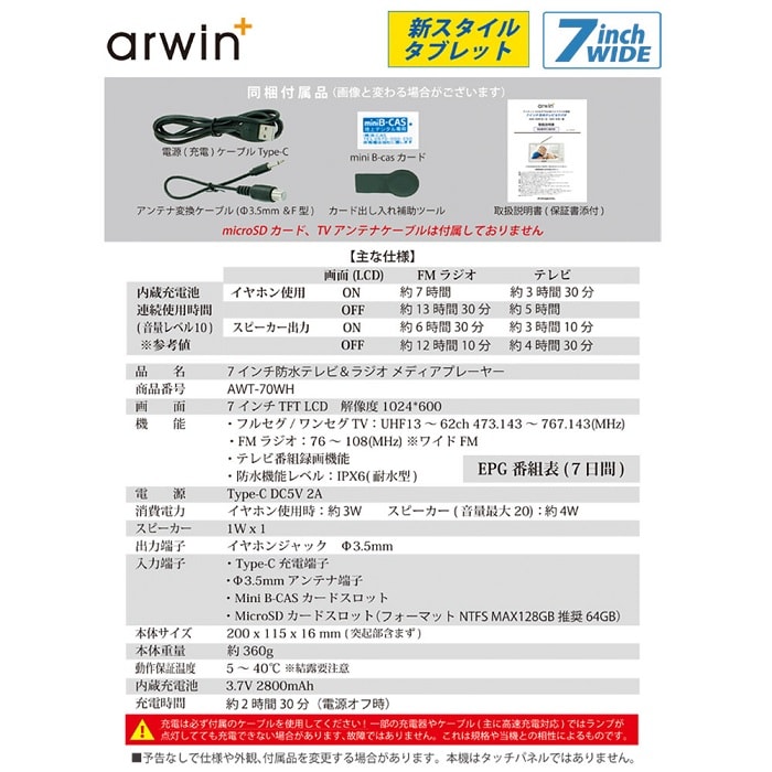 - arwin 7インチ防水テレビ&ラジオ&メディアプレーヤー AWT-70WH