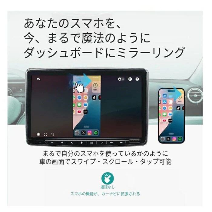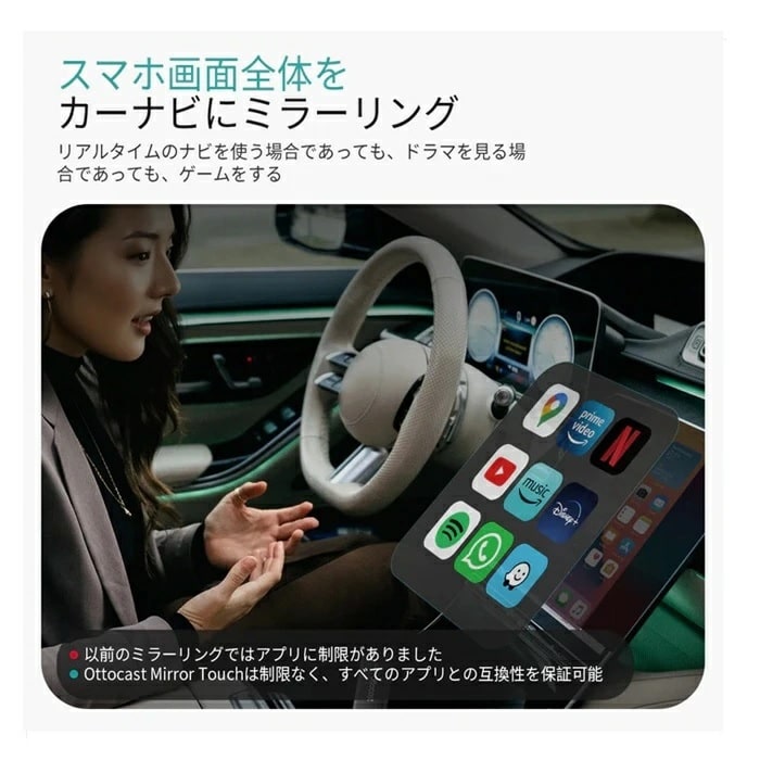 【双方向制御・高度自由化】「Ottocast Mirror Touch」は市場で唯一、カーナビとスマホの双方向操作を可能にする驚くべき製品です。スマホを魔法のようにディスプレイにミラーリングできます。従来の製品の限界とは異なり、「 Mirror Touch」を接続すれば、スマホにあるものはカーナビで1:1に複製して使用でき、車載ディスプレイにスフイプ・スクロール・タップ可能です。