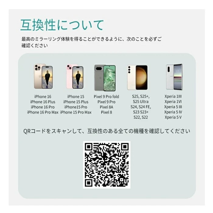 ・注意事項:【お試し前のご注意】 本製品をご利用いただくには、車載システムに有線式 CarPlay が搭載され、かつ CarPlay 機能が有効化されている必要があります。CarPlay 非対応車両では使用できませんので必ず事前にご確認ください。ミラーリング機能は iPhone15 以降のモデル(※iPhone16E を除く)および DisplayPort(DP)出力によるスクリーンミラーリングに対応した Android スマートフォンに対応しています。万一ご利用の車種やスマートフォンが対応条件を満たしているにもかかわらず正常に動作しない場合は、ファームウェアのアップデートで改善できる可能性があります。アップデート方法は付属の取扱説明書をご参照いただくか、カスタマーサポートまでお問い合わせください。