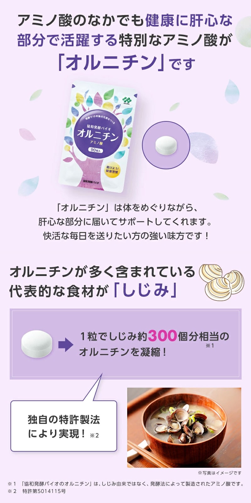 「1日目安量6粒に、しじみ1,800個分相当※のオルニチン配合」