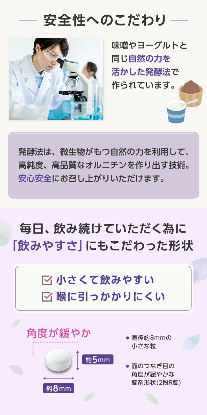 ・原材料/材質/素材:内容量:オルニチン、セルロース、環状オリゴ糖、ショ糖エステル、糊料(プルラン)、リン酸カルシウム