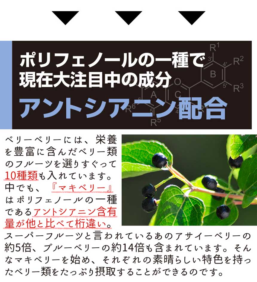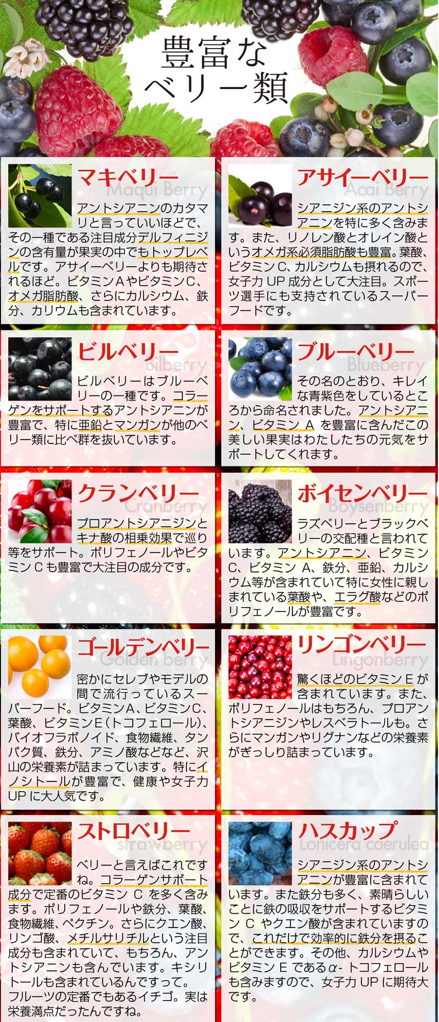 ・原材料/材質/素材:デキストリン、マキベリー果汁末、ビルベリーエキス末、ブルーベリー果汁末、クランベリー果汁末、ゴールデンベリー果汁末、ボイセンベリー果汁末、リンゴンベリー果汁末、ハスカップ果汁末、アサイー果汁末、ストロベリー果汁末、マリーゴールドエキス末(ルテイン含有)、目薬の木エキス末、アイブライトエキス末、セルロース、着色料、ショ糖脂肪酸エステル、ビタミンA、微粒二酸化ケイ素