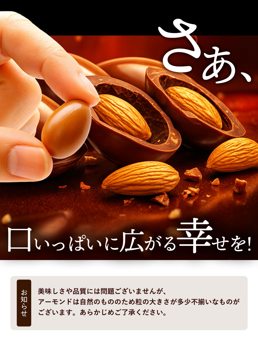 チョコとアーモンドの相性は抜群!カリッと香ばしいアーモンドを ショコラティエが厳選した贅沢クーベルチュール使用のチョコレートで包みました。