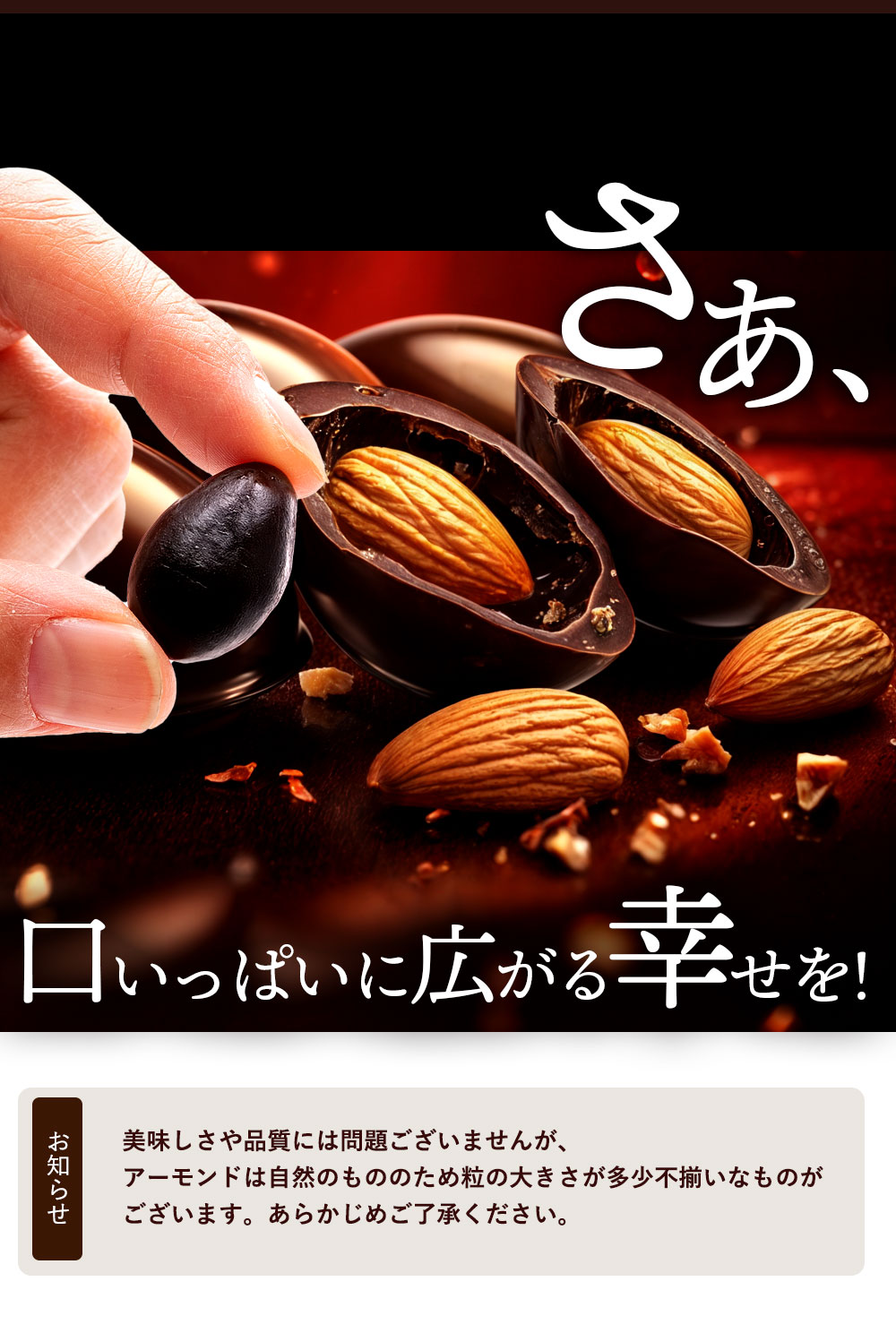 チョコとアーモンドの相性は抜群!カリッと香ばしいアーモンドを ショコラティエが厳選した贅沢クーベルチュール使用のチョコレートで包みました。