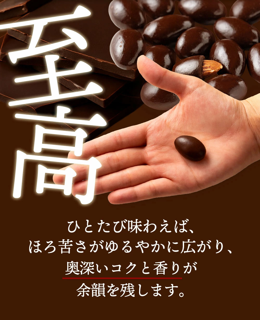 チョコ好き必見! カリッと香ばしいアーモンドを、ショコラティエ厳選の高級クーベルチュールでたっぷり包み込みました。 ひと口かじれば、濃厚でなめらかなチョコと香ばしいアーモンドのハーモニーが口いっぱいに広がります。