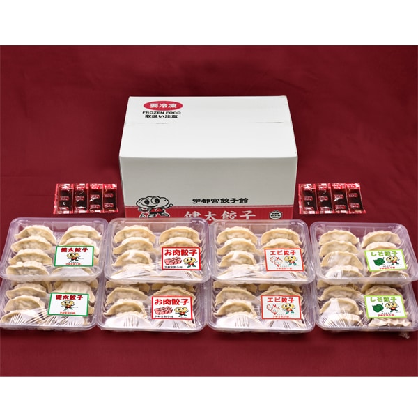 - 健太餃子、お肉餃子、しそ餃子、エビ餃子×2パック(1パックに各20g×各8個入、計64個)、たれ10g×8袋