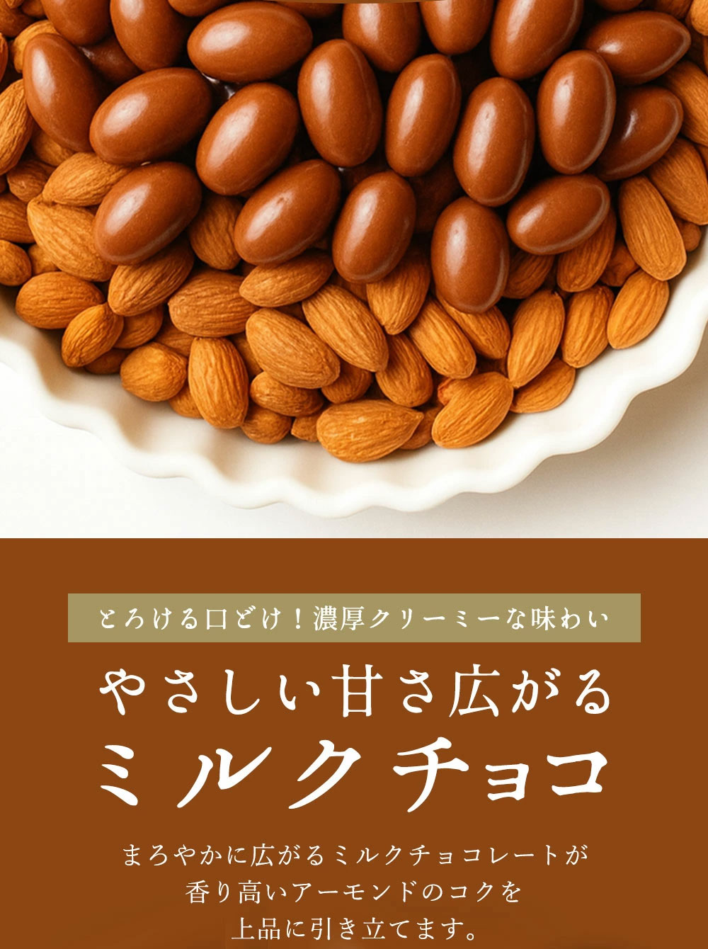 ・原材料/材質/素材:アーモンド(アメリカ)、砂糖、ココアバター、全粉乳、カカオマス、水飴/光沢剤、乳化剤、香料、(一部にアーモンド・乳成分・大豆を含む