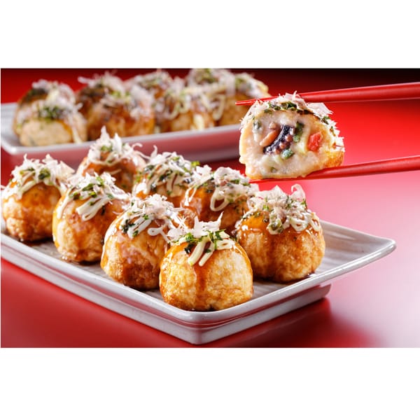 九条ねぎを使用して作り上げた、ダシの効いた関西風の風味豊かな大粒のたこ焼きです。トレーのままレンジで簡単に調理ができ、添付のソースをかけてそのままお召し上がりいただけます。