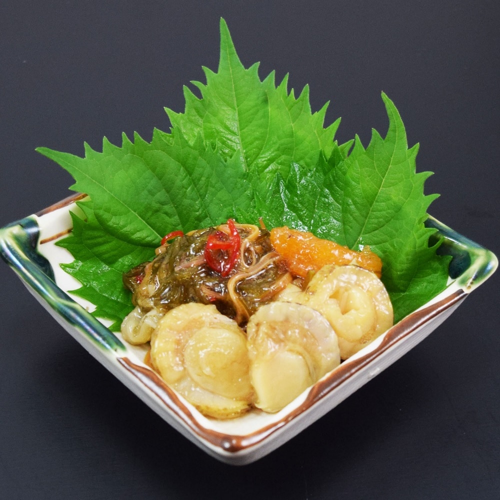 ・原材料/材質/素材:帆立(日本産)、めかぶ(中国産)、醤油、いか(ペルー産)、数の子、砂糖、発酵調味料、風味調味料(かつお)、昆布、唐辛子/調味料(アミノ酸等)、増粘剤(キサンタンガム)、(原材料の一部に大豆、小麦、ゼラチンを含む)